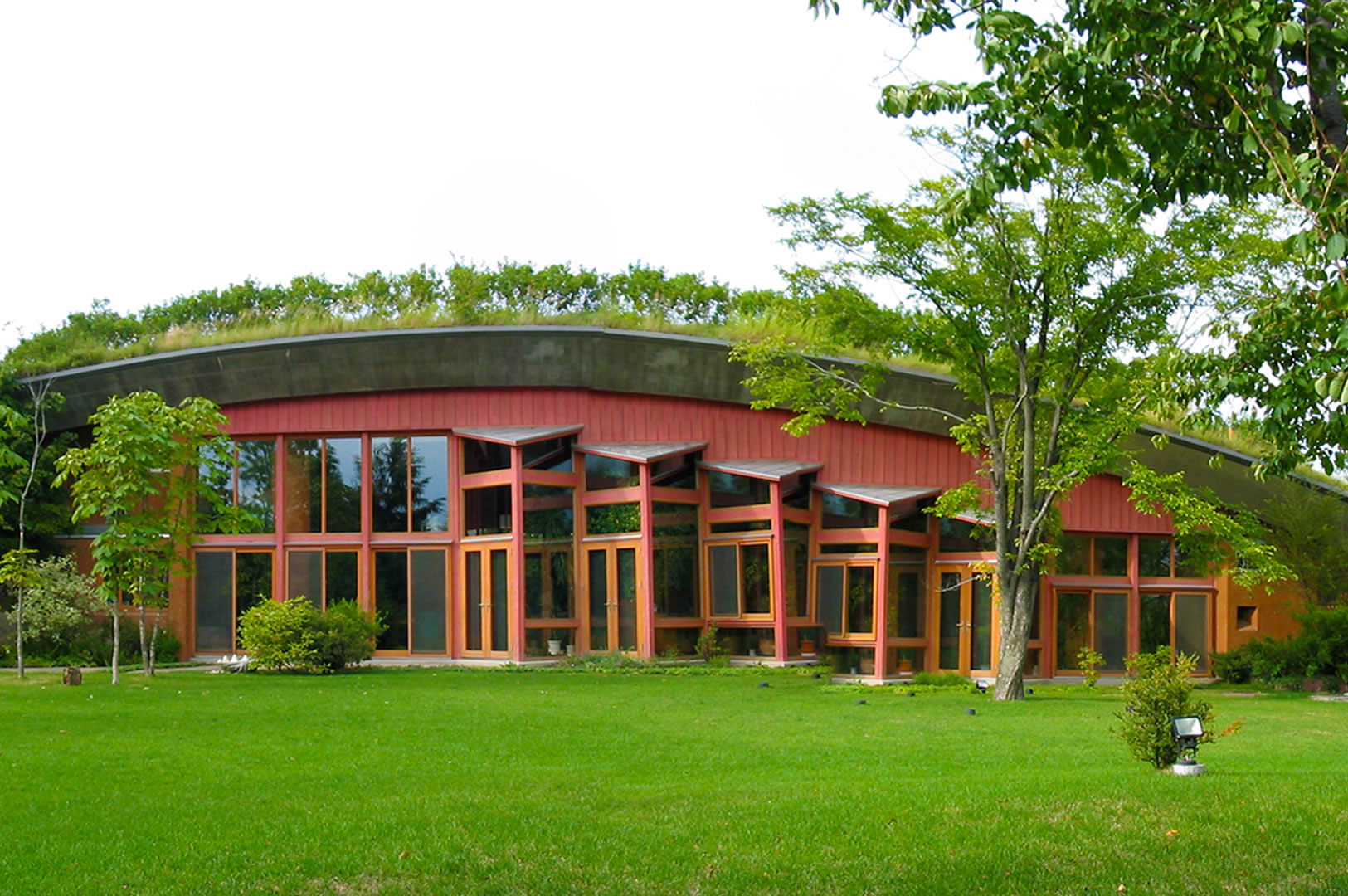 北海道 我们认为21世纪的建筑施工企业应“以人类活动与自然环境共生为目标”,因此将办公楼设计成被绿色覆盖、与自然环境融为一体的建筑。
